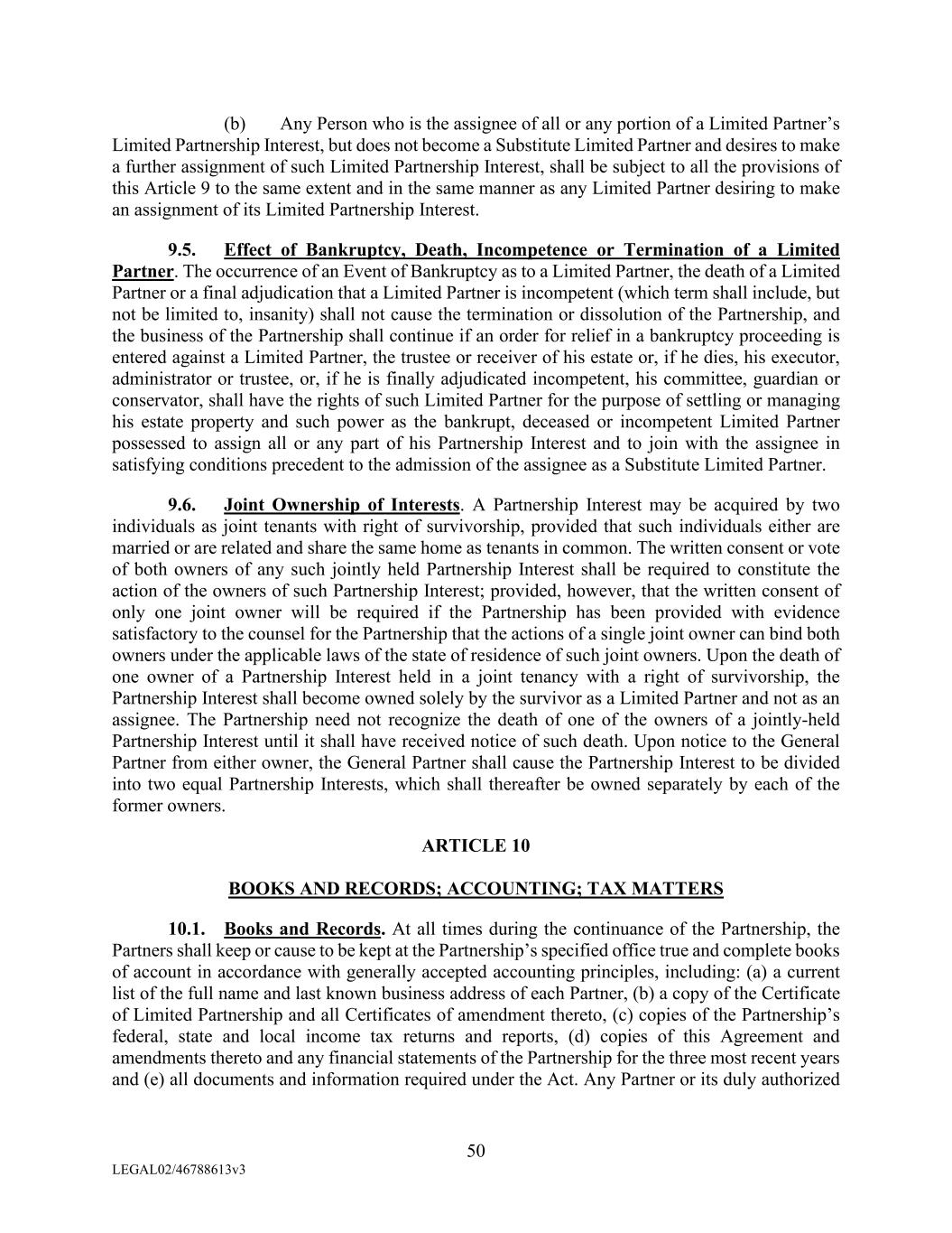 50 LEGAL02/46788613v3 (b) Any Person who is the assignee of all or any portion of a Limited Partner’s Limited Partnership Interest, but does not become a Substitute Limited Partner and desires to make a further assignment of such Limited Partnership Interest, shall be subject to all the provisions of this Article 9 to the same extent and in the same manner as any Limited Partner desiring to make an assignment of its Limited Partnership Interest. 9.5. Effect of Bankruptcy, Death, Incompetence or Termination of a Limited Partner. The occurrence of an Event of Bankruptcy as to a Limited Partner, the death of a Limited Partner or a final adjudication that a Limited Partner is incompetent (which term shall include, but not be limited to, insanity) shall not cause the termination or dissolution of the Partnership, and the business of the Partnership shall continue if an order for relief in a bankruptcy proceeding is entered against a Limited Partner, the trustee or receiver of his estate or, if he dies, his executor, administrator or trustee, or, if he is finally adjudicated incompetent, his committee, guardian or conservator, shall have the rights of such Limited Partner for the purpose of settling or managing his estate property and such power as the bankrupt, deceased or incompetent Limited Partner possessed to assign all or any part of his Partnership Interest and to join with the assignee in satisfying conditions precedent to the admission of the assignee as a Substitute Limited Partner. 9.6. Joint Ownership of Interests. A Partnership Interest may be acquired by two individuals as joint tenants with right of survivorship, provided that such individuals either are married or are related and share the same home as tenants in common. The written consent or vote of both owners of any such jointly held Partnership Interest shall be required to constitute the action of the owners of such Partnership Interest; provided, however, that the written consent of only one joint owner will be required if the Partnership has been provided with evidence satisfactory to the counsel for the Partnership that the actions of a single joint owner can bind both owners under the applicable laws of the state of residence of such joint owners. Upon the death of one owner of a Partnership Interest held in a joint tenancy with a right of survivorship, the Partnership Interest shall become owned solely by the survivor as a Limited Partner and not as an assignee. The Partnership need not recognize the death of one of the owners of a jointly-held Partnership Interest until it shall have received notice of such death. Upon notice to the General Partner from either owner, the General Partner shall cause the Partnership Interest to be divided into two equal Partnership Interests, which shall thereafter be owned separately by each of the former owners. ARTICLE 10 BOOKS AND RECORDS; ACCOUNTING; TAX MATTERS 10.1. Books and Records. At all times during the continuance of the Partnership, the Partners shall keep or cause to be kept at the Partnership’s specified office true and complete books of account in accordance with generally accepted accounting principles, including: (a) a current list of the full name and last known business address of each Partner, (b) a copy of the Certificate of Limited Partnership and all Certificates of amendment thereto, (c) copies of the Partnership’s federal, state and local income tax returns and reports, (d) copies of this Agreement and amendments thereto and any financial statements of the Partnership for the three most recent years and (e) all documents and information required under the Act. Any Partner or its duly authorized