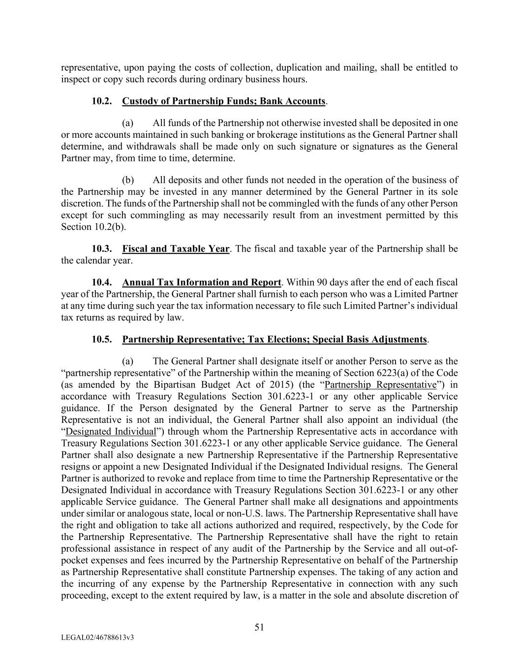 51 LEGAL02/46788613v3 representative, upon paying the costs of collection, duplication and mailing, shall be entitled to inspect or copy such records during ordinary business hours. 10.2. Custody of Partnership Funds; Bank Accounts. (a) All funds of the Partnership not otherwise invested shall be deposited in one or more accounts maintained in such banking or brokerage institutions as the General Partner shall determine, and withdrawals shall be made only on such signature or signatures as the General Partner may, from time to time, determine. (b) All deposits and other funds not needed in the operation of the business of the Partnership may be invested in any manner determined by the General Partner in its sole discretion. The funds of the Partnership shall not be commingled with the funds of any other Person except for such commingling as may necessarily result from an investment permitted by this Section 10.2(b). 10.3. Fiscal and Taxable Year. The fiscal and taxable year of the Partnership shall be the calendar year. 10.4. Annual Tax Information and Report. Within 90 days after the end of each fiscal year of the Partnership, the General Partner shall furnish to each person who was a Limited Partner at any time during such year the tax information necessary to file such Limited Partner’s individual tax returns as required by law. 10.5. Partnership Representative; Tax Elections; Special Basis Adjustments. (a) The General Partner shall designate itself or another Person to serve as the “partnership representative” of the Partnership within the meaning of Section 6223(a) of the Code (as amended by the Bipartisan Budget Act of 2015) (the “Partnership Representative”) in accordance with Treasury Regulations Section 301.6223-1 or any other applicable Service guidance. If the Person designated by the General Partner to serve as the Partnership Representative is not an individual, the General Partner shall also appoint an individual (the “Designated Individual”) through whom the Partnership Representative acts in accordance with Treasury Regulations Section 301.6223-1 or any other applicable Service guidance. The General Partner shall also designate a new Partnership Representative if the Partnership Representative resigns or appoint a new Designated Individual if the Designated Individual resigns. The General Partner is authorized to revoke and replace from time to time the Partnership Representative or the Designated Individual in accordance with Treasury Regulations Section 301.6223-1 or any other applicable Service guidance. The General Partner shall make all designations and appointments under similar or analogous state, local or non-U.S. laws. The Partnership Representative shall have the right and obligation to take all actions authorized and required, respectively, by the Code for the Partnership Representative. The Partnership Representative shall have the right to retain professional assistance in respect of any audit of the Partnership by the Service and all out-of- pocket expenses and fees incurred by the Partnership Representative on behalf of the Partnership as Partnership Representative shall constitute Partnership expenses. The taking of any action and the incurring of any expense by the Partnership Representative in connection with any such proceeding, except to the extent required by law, is a matter in the sole and absolute discretion of