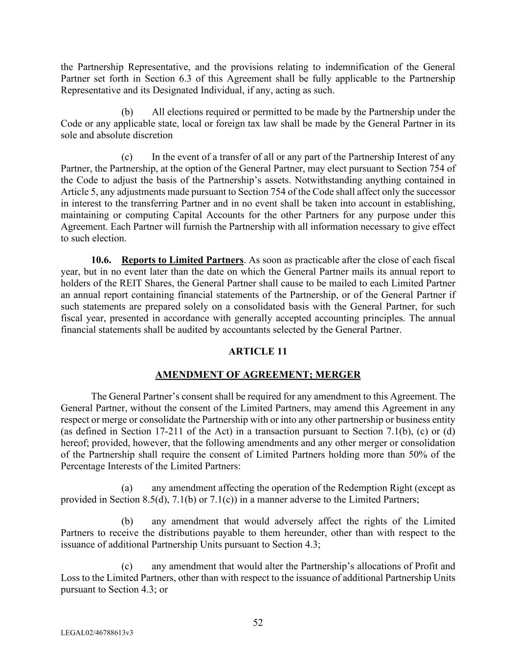 52 LEGAL02/46788613v3 the Partnership Representative, and the provisions relating to indemnification of the General Partner set forth in Section 6.3 of this Agreement shall be fully applicable to the Partnership Representative and its Designated Individual, if any, acting as such. (b) All elections required or permitted to be made by the Partnership under the Code or any applicable state, local or foreign tax law shall be made by the General Partner in its sole and absolute discretion (c) In the event of a transfer of all or any part of the Partnership Interest of any Partner, the Partnership, at the option of the General Partner, may elect pursuant to Section 754 of the Code to adjust the basis of the Partnership’s assets. Notwithstanding anything contained in Article 5, any adjustments made pursuant to Section 754 of the Code shall affect only the successor in interest to the transferring Partner and in no event shall be taken into account in establishing, maintaining or computing Capital Accounts for the other Partners for any purpose under this Agreement. Each Partner will furnish the Partnership with all information necessary to give effect to such election. 10.6. Reports to Limited Partners. As soon as practicable after the close of each fiscal year, but in no event later than the date on which the General Partner mails its annual report to holders of the REIT Shares, the General Partner shall cause to be mailed to each Limited Partner an annual report containing financial statements of the Partnership, or of the General Partner if such statements are prepared solely on a consolidated basis with the General Partner, for such fiscal year, presented in accordance with generally accepted accounting principles. The annual financial statements shall be audited by accountants selected by the General Partner. ARTICLE 11 AMENDMENT OF AGREEMENT; MERGER The General Partner’s consent shall be required for any amendment to this Agreement. The General Partner, without the consent of the Limited Partners, may amend this Agreement in any respect or merge or consolidate the Partnership with or into any other partnership or business entity (as defined in Section 17-211 of the Act) in a transaction pursuant to Section 7.1(b), (c) or (d) hereof; provided, however, that the following amendments and any other merger or consolidation of the Partnership shall require the consent of Limited Partners holding more than 50% of the Percentage Interests of the Limited Partners: (a) any amendment affecting the operation of the Redemption Right (except as provided in Section 8.5(d), 7.1(b) or 7.1(c)) in a manner adverse to the Limited Partners; (b) any amendment that would adversely affect the rights of the Limited Partners to receive the distributions payable to them hereunder, other than with respect to the issuance of additional Partnership Units pursuant to Section 4.3; (c) any amendment that would alter the Partnership’s allocations of Profit and Loss to the Limited Partners, other than with respect to the issuance of additional Partnership Units pursuant to Section 4.3; or