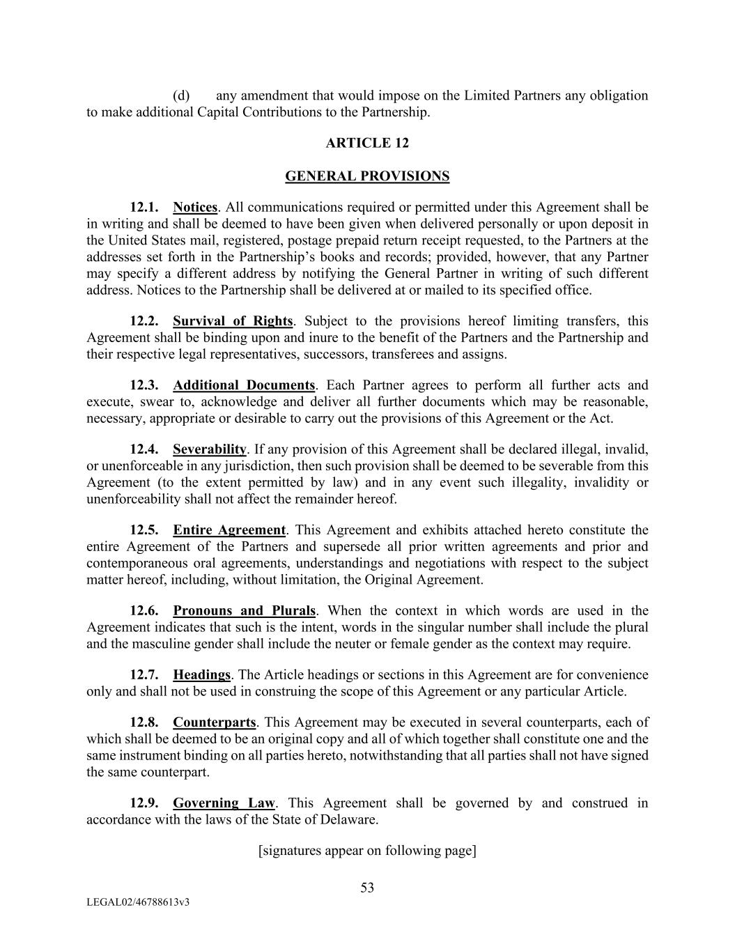 53 LEGAL02/46788613v3 (d) any amendment that would impose on the Limited Partners any obligation to make additional Capital Contributions to the Partnership. ARTICLE 12 GENERAL PROVISIONS 12.1. Notices. All communications required or permitted under this Agreement shall be in writing and shall be deemed to have been given when delivered personally or upon deposit in the United States mail, registered, postage prepaid return receipt requested, to the Partners at the addresses set forth in the Partnership’s books and records; provided, however, that any Partner may specify a different address by notifying the General Partner in writing of such different address. Notices to the Partnership shall be delivered at or mailed to its specified office. 12.2. Survival of Rights. Subject to the provisions hereof limiting transfers, this Agreement shall be binding upon and inure to the benefit of the Partners and the Partnership and their respective legal representatives, successors, transferees and assigns. 12.3. Additional Documents. Each Partner agrees to perform all further acts and execute, swear to, acknowledge and deliver all further documents which may be reasonable, necessary, appropriate or desirable to carry out the provisions of this Agreement or the Act. 12.4. Severability. If any provision of this Agreement shall be declared illegal, invalid, or unenforceable in any jurisdiction, then such provision shall be deemed to be severable from this Agreement (to the extent permitted by law) and in any event such illegality, invalidity or unenforceability shall not affect the remainder hereof. 12.5. Entire Agreement. This Agreement and exhibits attached hereto constitute the entire Agreement of the Partners and supersede all prior written agreements and prior and contemporaneous oral agreements, understandings and negotiations with respect to the subject matter hereof, including, without limitation, the Original Agreement. 12.6. Pronouns and Plurals. When the context in which words are used in the Agreement indicates that such is the intent, words in the singular number shall include the plural and the masculine gender shall include the neuter or female gender as the context may require. 12.7. Headings. The Article headings or sections in this Agreement are for convenience only and shall not be used in construing the scope of this Agreement or any particular Article. 12.8. Counterparts. This Agreement may be executed in several counterparts, each of which shall be deemed to be an original copy and all of which together shall constitute one and the same instrument binding on all parties hereto, notwithstanding that all parties shall not have signed the same counterpart. 12.9. Governing Law. This Agreement shall be governed by and construed in accordance with the laws of the State of Delaware. [signatures appear on following page]