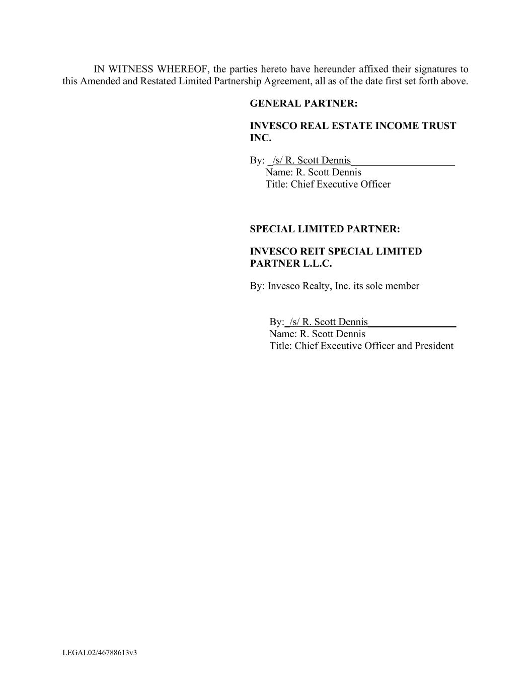 LEGAL02/46788613v3 IN WITNESS WHEREOF, the parties hereto have hereunder affixed their signatures to this Amended and Restated Limited Partnership Agreement, all as of the date first set forth above. GENERAL PARTNER: INVESCO REAL ESTATE INCOME TRUST INC. By: _/s/ ▇. ▇▇▇▇▇ ▇▇▇▇▇▇____________________ Name: R. ▇▇▇▇▇ ▇▇▇▇▇▇ Title: Chief Executive Officer SPECIAL LIMITED PARTNER: INVESCO REIT SPECIAL LIMITED PARTNER L.L.C. By: Invesco Realty, Inc. its sole member By:_/s/ ▇. ▇▇▇▇▇ ▇▇▇▇▇▇_________________ Name: ▇. ▇▇▇▇▇ ▇▇▇▇▇▇ Title: Chief Executive Officer and President