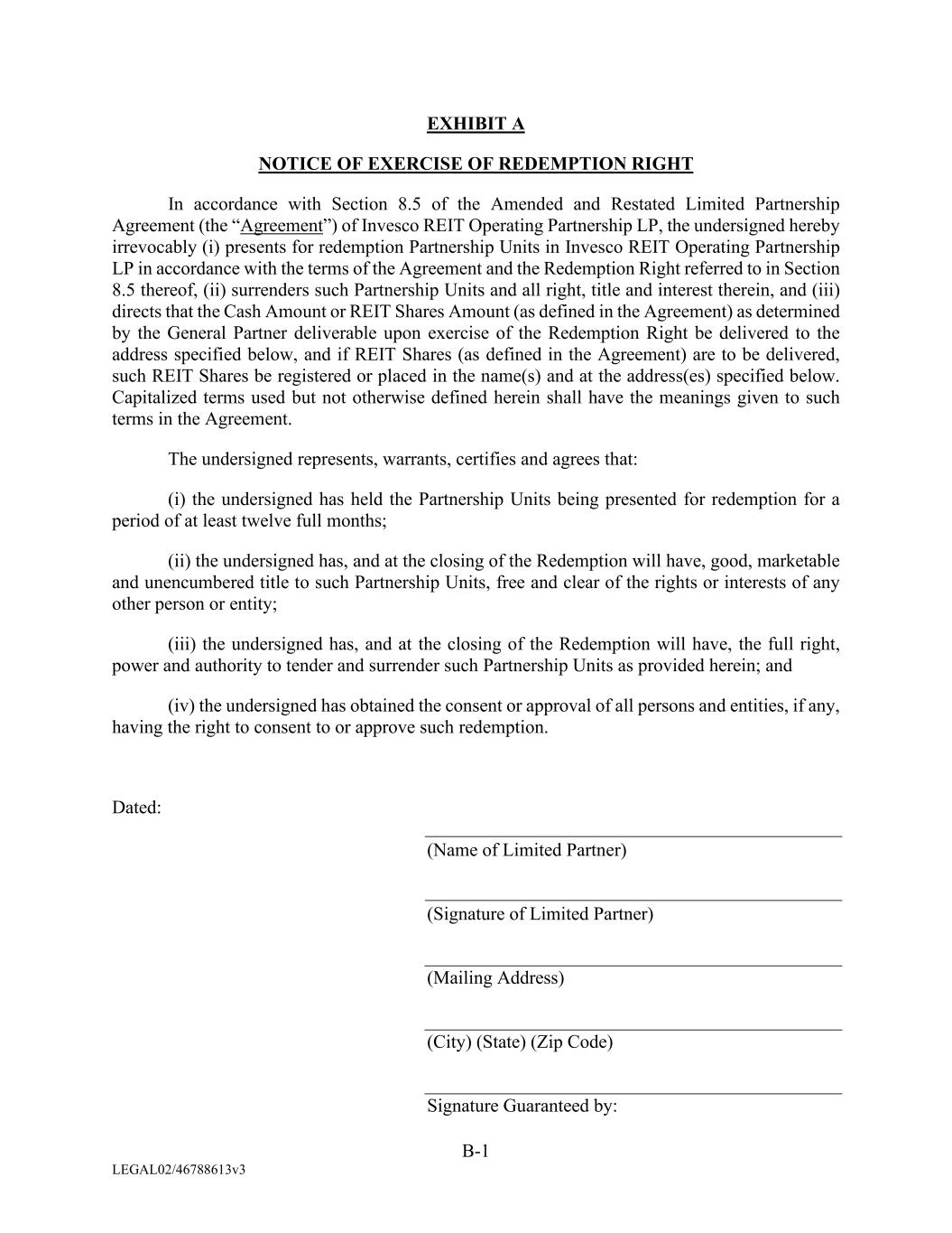 B-1 LEGAL02/46788613v3 EXHIBIT A NOTICE OF EXERCISE OF REDEMPTION RIGHT In accordance with Section 8.5 of the Amended and Restated Limited Partnership Agreement (the “Agreement”) of Invesco REIT Operating Partnership LP, the undersigned hereby irrevocably (i) presents for redemption Partnership Units in Invesco REIT Operating Partnership LP in accordance with the terms of the Agreement and the Redemption Right referred to in Section 8.5 thereof, (ii) surrenders such Partnership Units and all right, title and interest therein, and (iii) directs that the Cash Amount or REIT Shares Amount (as defined in the Agreement) as determined by the General Partner deliverable upon exercise of the Redemption Right be delivered to the address specified below, and if REIT Shares (as defined in the Agreement) are to be delivered, such REIT Shares be registered or placed in the name(s) and at the address(es) specified below. Capitalized terms used but not otherwise defined herein shall have the meanings given to such terms in the Agreement. The undersigned represents, warrants, certifies and agrees that: (i) the undersigned has held the Partnership Units being presented for redemption for a period of at least twelve full months; (ii) the undersigned has, and at the closing of the Redemption will have, good, marketable and unencumbered title to such Partnership Units, free and clear of the rights or interests of any other person or entity; (iii) the undersigned has, and at the closing of the Redemption will have, the full right, power and authority to tender and surrender such Partnership Units as provided herein; and (iv) the undersigned has obtained the consent or approval of all persons and entities, if any, having the right to consent to or approve such redemption. Dated: (Name of Limited Partner) (Signature of Limited Partner) (Mailing Address) (City) (State) (Zip Code) Signature Guaranteed by: